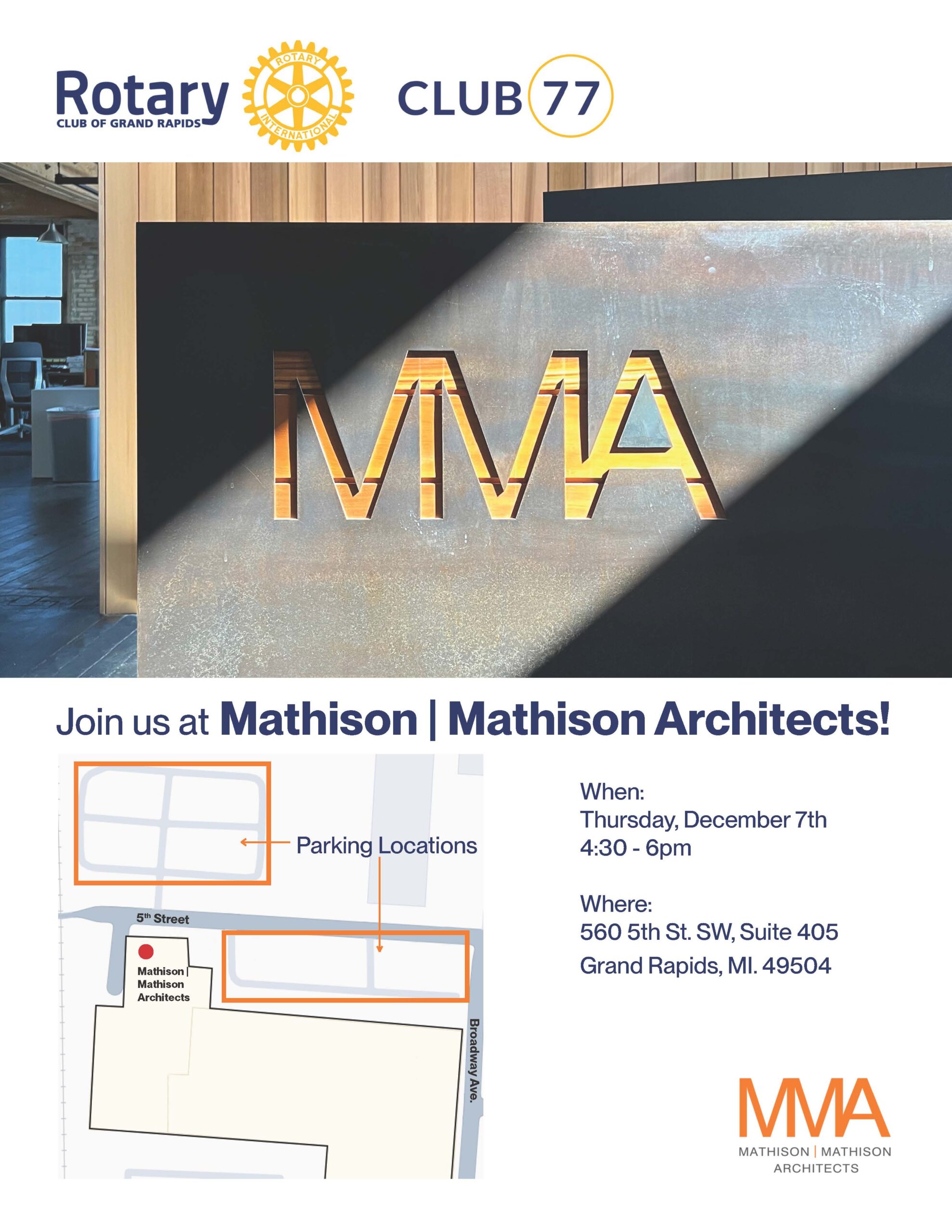 Come join us for our monthly Club 77 event hosted by Mathison Architects and Rotarian Tom Mathison!